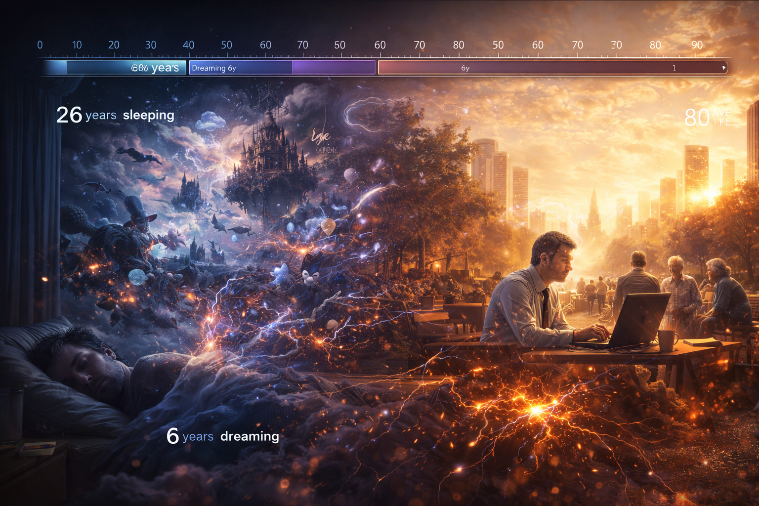 Pokud shrneme dostupná data, průměrný člověk stráví přibližně dvacet šest let spánkem a zhruba šest let ve stavu snění. To znamená, že více než třetinu života prožíváme mimo běžné vědomé vnímání světa.